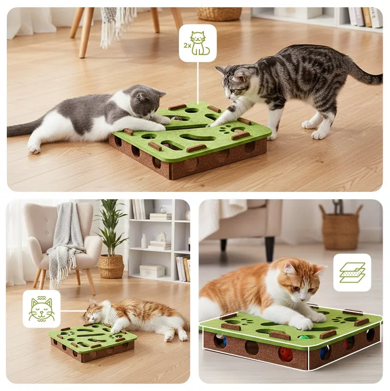 Our exercise toy combines scratching, chasing, and hiding in one spot. Each session offers unique opportunities for pets to move and explore.