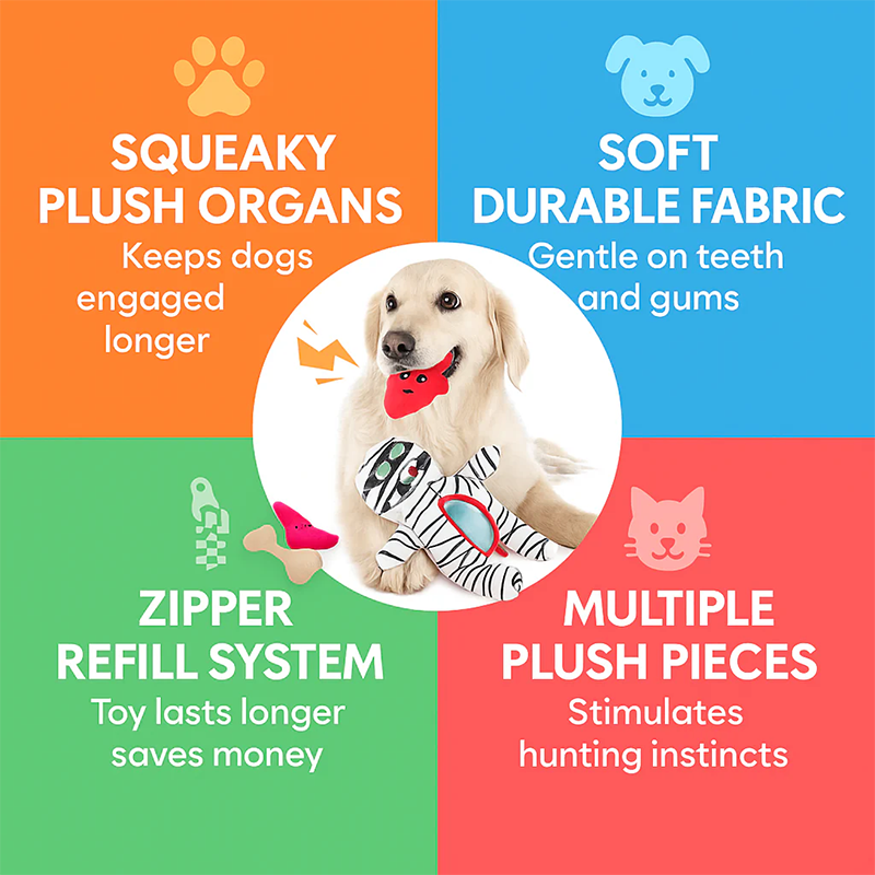 Creative Design: Our designers have filled the mummy's body with eight small squeaky organs! These organs include the heart, lungs, stomach, and others. Each one has a cute facial expression.
